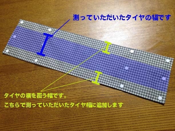 タイヤ外周124cmの場合、カバーサイズは長さ約130cm・幅約18cmで制作しました。